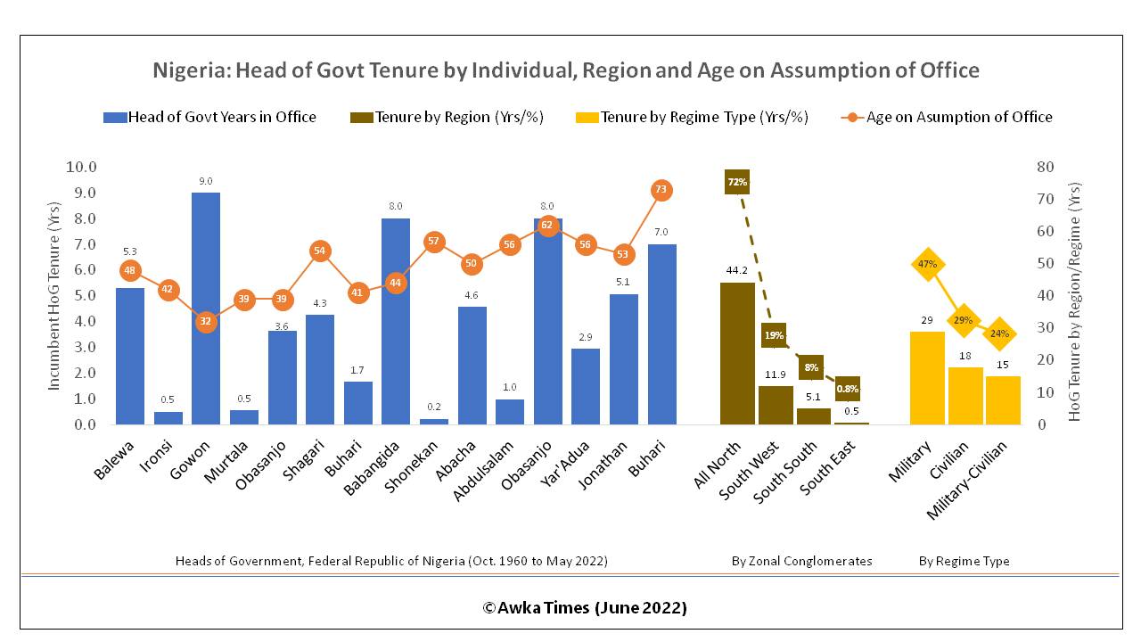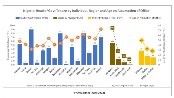 The poignant reality of Igbo political exclusion is depicted in the featured chart above. The chart identifies all the heads of the Nigerian federal government since independence in 1960, and aggregates incumbent tenures by region and regime type.